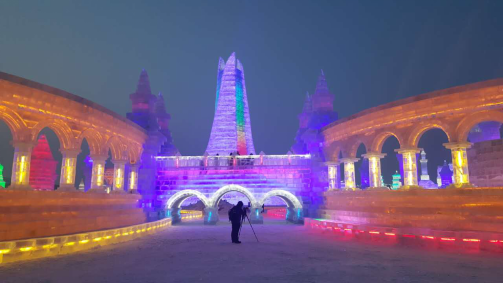 从12月4日采冰,到12月21日施工基本结束,哈尔滨冰雪大世界的9600名施工建设者日夜奋战,用汗水与智慧铸就了这个“北国盛景 人间奇迹”。本届哈尔滨冰雪大世界总用冰用雪量之大,创历年之最,其中用雪量达15万立方米,用冰量更是达到了18万立方米。