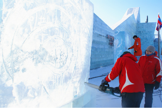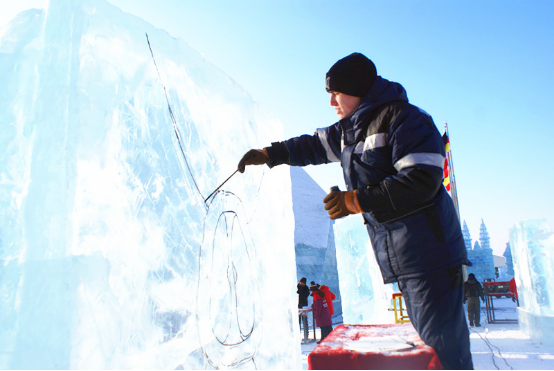 6日上午,各国冰雕大师们早早来到了比赛现场。他们先对照图纸用颜料笔勾勒出雕刻图案,再用冰铲、油锯对冰料进行加工。虽然气温较低,一杯热气腾腾的香飘飘奶茶为选手们驱散了严寒,为大赛助力加油。