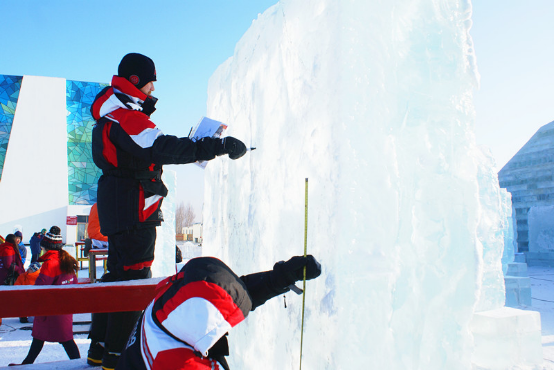 据介绍,国际冰雕比赛全部采用整体固定天然冰,冰块高2米,宽2米,厚0.6米。冰块下设冰台座,座高0.8米,内设灯光。比赛要求选手使用全部冰块,并且要在冰块四面进行艺术处理。作品可根据需要在高度或其他侧面超出0.5米,但只能用本体冰进行粘接。比赛材料只允许用冰和水,不允许在冰体内设骨架,外部不涂颜色。在比赛过程及作品完成后均不得使用支架和加强料。