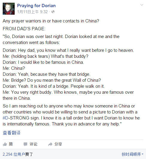 这次圆多里安的“长城愿望”,最初就发起自脸书主页。2016年1月11日,“为多里安祈福”的主页上多了这样一条消息——“各位网友,有人在中国或者认识中国的朋友吗?”“你们可以在长城上举着“D-STRONG”的标语拍张照片,然后发给我们吗?”这条消息附了一段转自多里安爸爸主页的对话。"昨晚,多里安撑过来了。他看着我,说了下面这段话:多里安:爸爸,你知道我上天堂前最想干什么吗?我:(忍住眼泪)最想干什么,宝贝?多里安:我想让中国人都能认识我。我:中国?多里安:对,因为他们有“那座桥”。我:桥?你是说“长城”吗?多里安:对。它也是桥啊,大家都在上面走。我:嗯,你说的对。说不定在中国,很多人真的认识你,谁知道呢。"