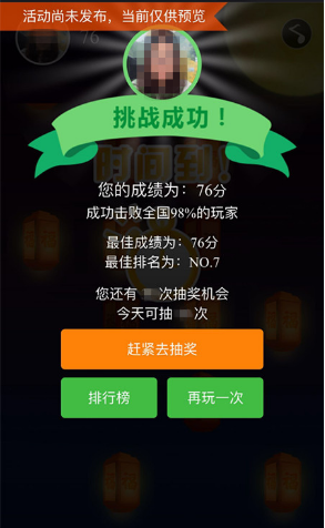 3、 游戏达到65分即可获得一次“摇一摇”的抽奖机会,每人每日有10次摇奖机会哦,每人最多可参与30次抽奖!