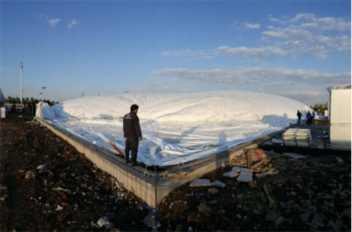 充气膜就像吹气球—样,施工人员用二台鼓风机总共吹了二个多小时,场馆轮廓逐渐体现。