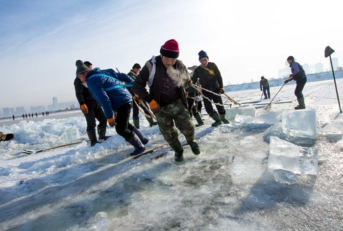 每一道采冰程序都严谨小心,不容有失。采冰师傅们娴熟且标准,规则有序的每一块方冰,都是冰雪大世界的基础原料。