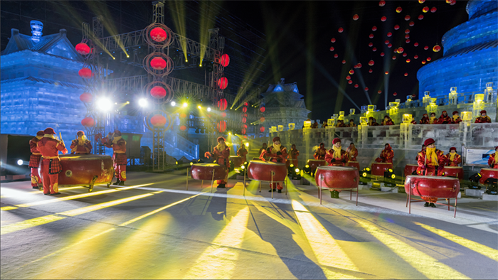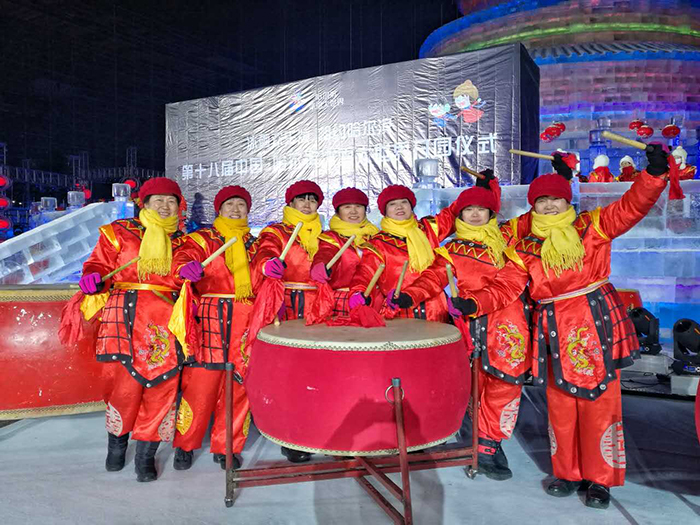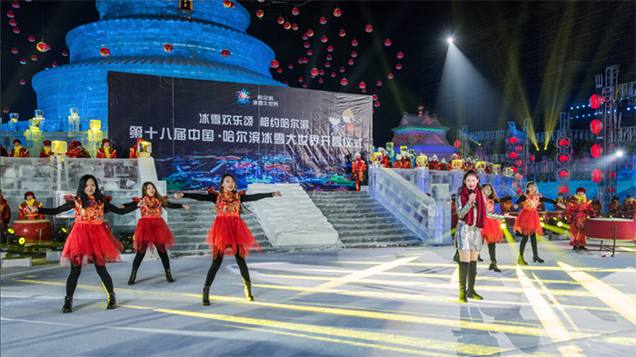 开园仪式简单而隆重、大气而热烈,晚19点30分,在威武雄壮的百人威风锣鼓声中,中外嘉宾和媒体记者齐聚春晚分会场。通过社会广泛征集评选出的哈尔滨冰雪大世界官方主题曲今天也正式发布。身着飘飘彩衣的舞蹈演员们伴随着《冰雪飞扬》的歌声翩翩起舞,犹如冰雪精灵的化身降临在冰雪大世界,拉开了开园仪式的序幕。仪式由黑龙江电视台著名节目主持人有才主持,哈尔滨市委常委、副市长曲磊正式宣布“第18届中国哈尔滨冰雪大世界正式开园”,此时,威风锣鼓再次震天响起,多彩的焰火表演正式开始,七彩烟花将冰雪大世界的夜空点亮,一届永不落幕的冰雪盛宴正式拉开帷幕。