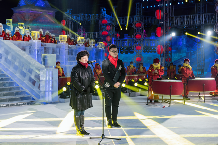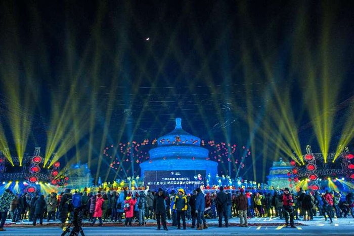 开园仪式在冰雪大世界天坛祈年殿央视春晚分会场举行。记者在现场看到,装饰一新的天坛祈年殿庄严而绚丽,在灯光的映衬下显得格外耀眼。随着2017年中央电视台鸡年春节联欢晚会落户哈尔滨冰雪大世界,在中央及省市各级领导部门的大力支持与配合下,冰雪大世界全体员工在欣喜之余更是鼓足了干劲,昼夜施工、保质保量地完成了工程浩大的场地建设,保证省台冰雪春晚和央视春晚的录制。