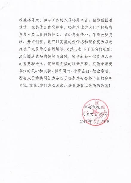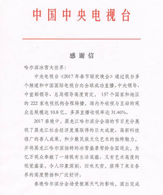 通过春晚平台,哈尔滨冰雪大世界被国际认知与关注,更是得到来自各界媒体的好评与赞誉,中国最高媒体中央电视台,也通过感谢信的发表,给予哈尔滨冰雪大世界最高的荣誉与肯定,更是表达了敬意与赞美!