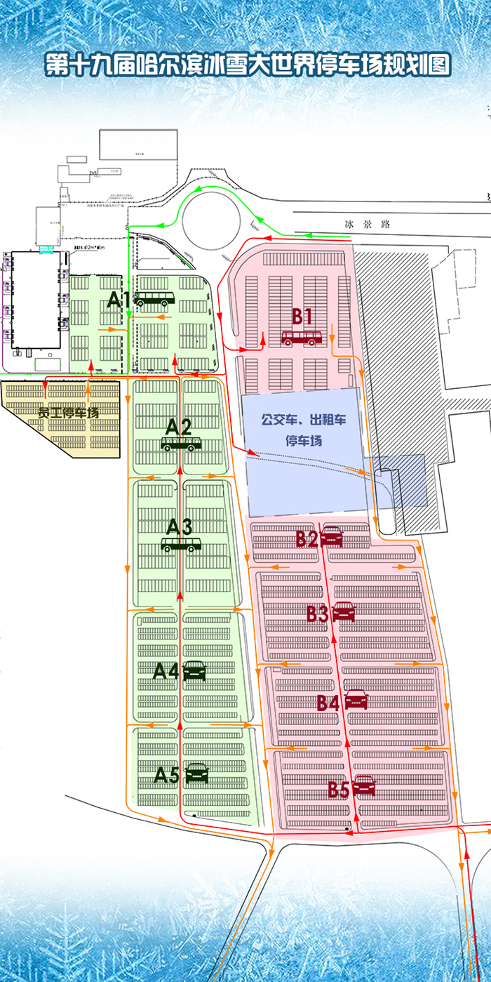 1.哈尔滨冰雪大世界周围主要路段松北大道、雪乡路,增设大型导引牌,方便游客辨识路标,容易找到停车场。