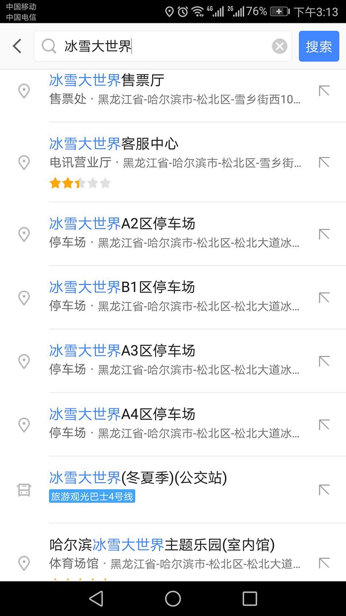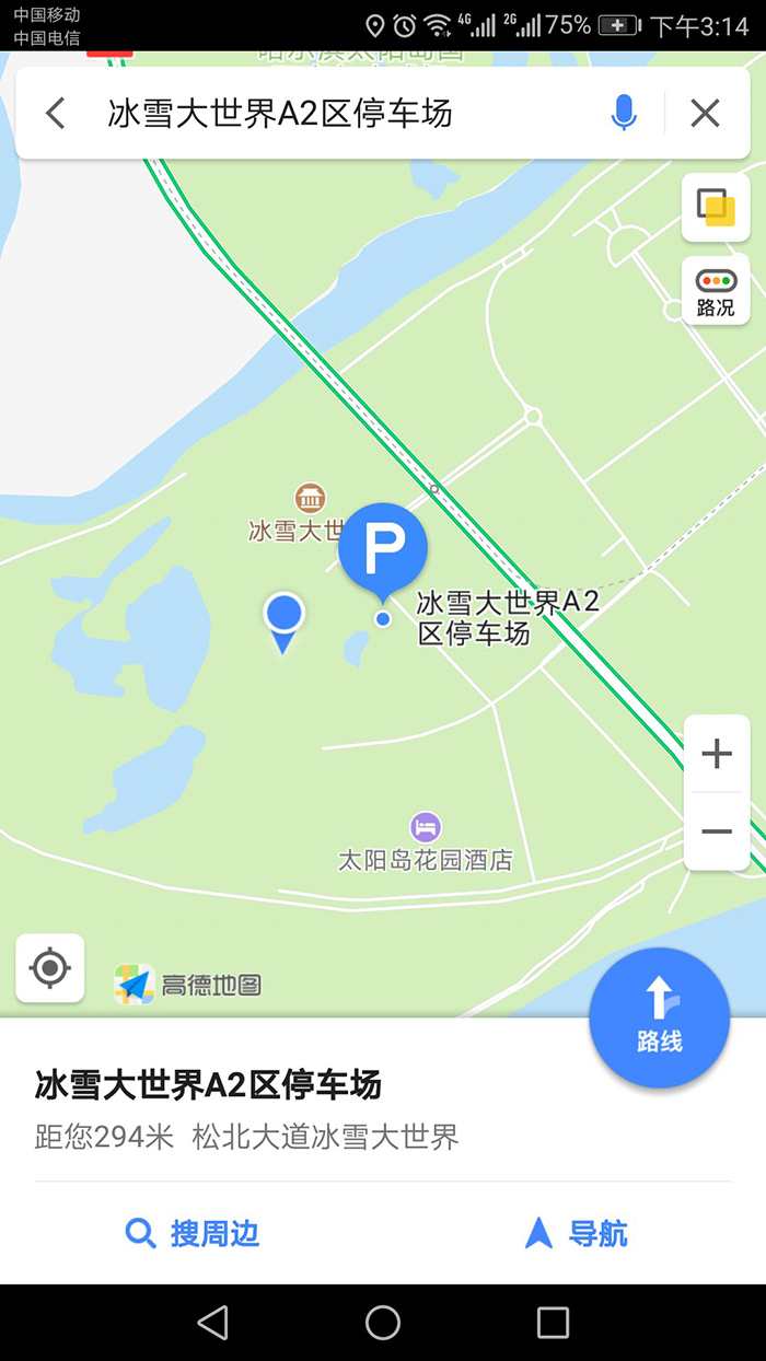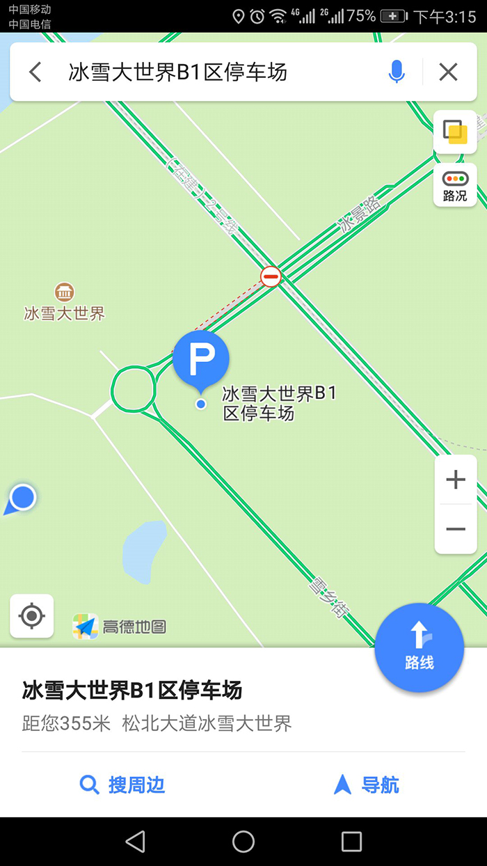 1.打开高德地图,搜索冰雪大世界,即可看到相应的停车场划分区域;