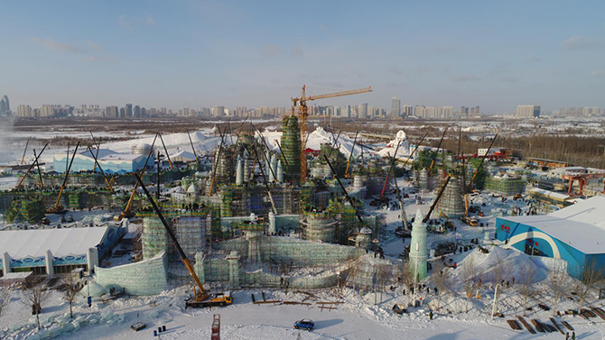 气势宏大的场面,热火朝天的场景,这张震撼的冰雪版“清明上河图”,便是第十九届哈尔滨冰雪大世界的施工现场。