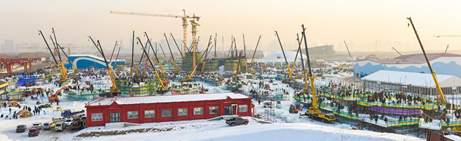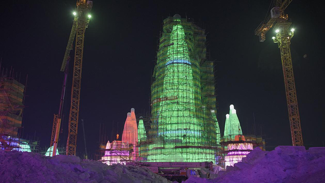 过了撂底期,冰建正处于拔高砌体阶段,拔高过程中各种冰建的高难度艺术造型需要逐一体现,如何精确定位坐标点、搭好钢结构,不能有半点差池。特别是主塔冰雪之冠、形象大门“冰城之约”、天坛圣境以及炫舞冰峰四个景观因为涉及到拱形及曲线等不规则建筑形态,也使施工难度大大增加。
