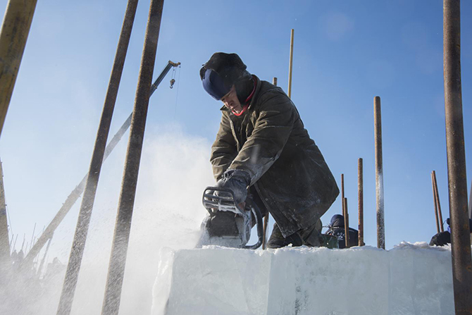 近万位冰建师冒着零下二十多度的严寒,手上工具嗡嗡轰鸣,溅起翻飞的碎冰屑,露在帽子和口罩外的头发、睫毛都挂满白霜,这样的情景在冰雪大世界的每个角落上演着。吊冰、砌冰、挖槽、放灯线、封冰,各工种紧密配合,机器轰鸣、车辆穿梭,施工期短短十天,冰建总体进度已完成60%,到了今年冰建期中最为关键的阶段。