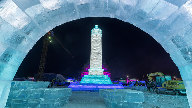 随着一声嘹亮的号子:“封冰啦!”,绚烂的烟花冲上天际,位于第十九届哈尔滨冰雪大世界园区内的“主塔——冰雪之冠”景观顶冰成功封砌,至此主塔冰建建设已全部完成。