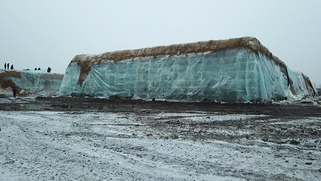 在这里,它们被盖上了草、塑料布、彩条布等足足八层“保寒棉被”,再用雪墙和厚厚的土保护起来。在这些“黑科技”的加持下,存冰场可以为冰体提供适宜的储存条件——低温、避光、隔热、密封,即使在气温超过30℃的炎热盛夏,冰体也不会融化。
