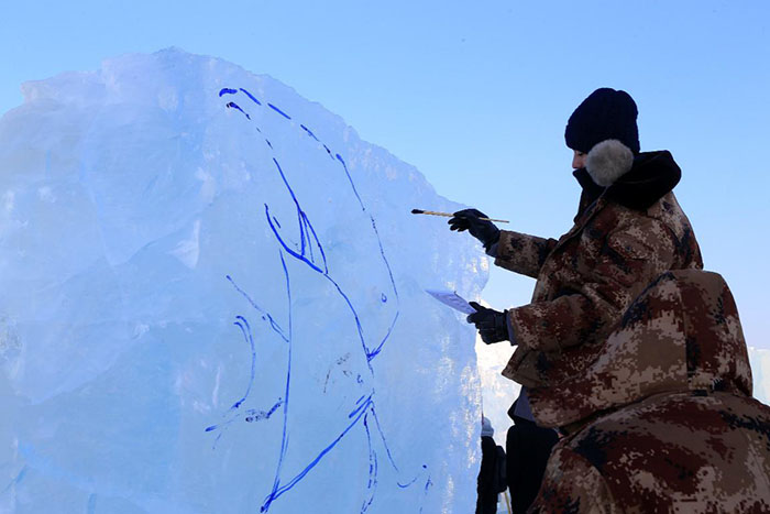 比赛开始后,所有选手均先以板刷起稿,高1.8米、宽1.5米、厚0.5米的冰材在他们的手下就像是一个画板。
