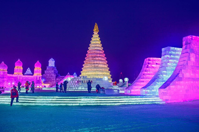 看!巨大的冰雕圣诞树亮起了彩色的灯光