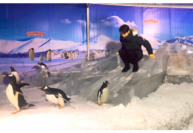 哈尔滨冰雪大世界特意请来了极地萌宠——南极白眉企鹅来跟男神一起互动!