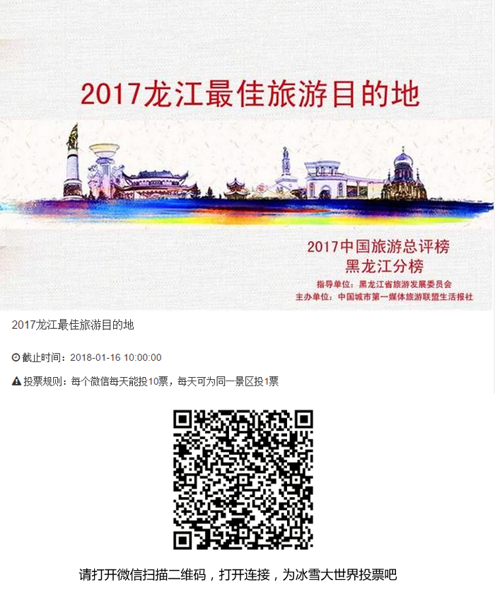 冰雪大世界正在参加2017龙江最佳旅游目的地评选,请大家为我们投票吧!