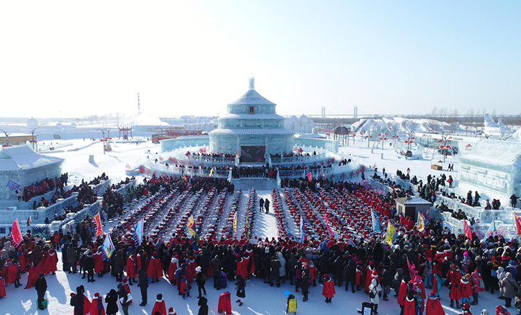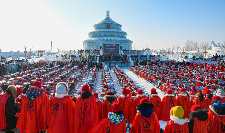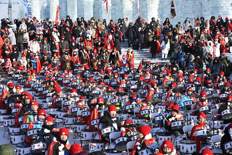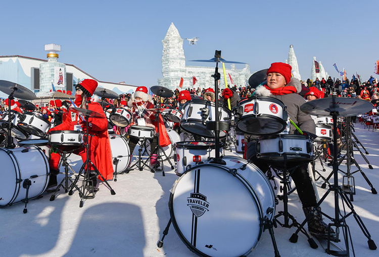 1月26日,来自全国各地的打击乐鼓手,在世界顶级冰雪景观哈尔滨冰雪大世界向世界纪录发起挑战。他们舞动冰雪魅力,展现火热激情,经过前期严格的审评、数据分析比较及现场认证,最终成功挑战世界纪录,创下“世界上最多人在冰雪上演奏打击乐”的世界纪录。