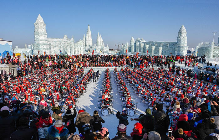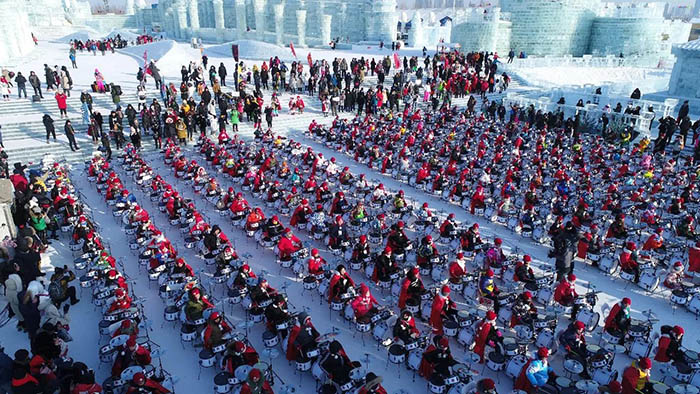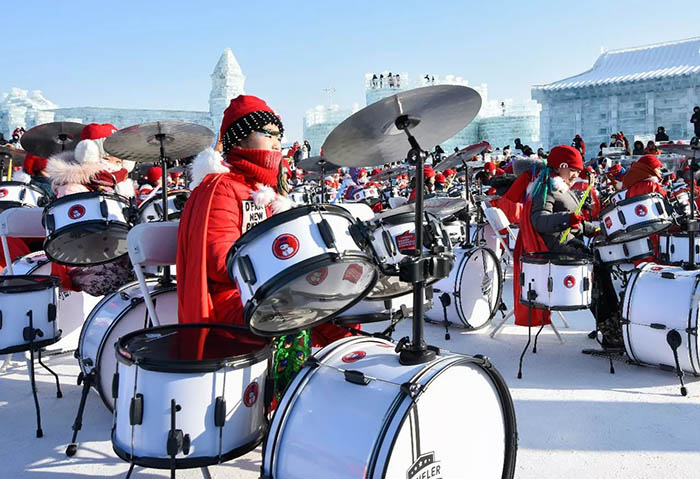 在今天的哈尔滨冰雪大世界,上千名来自全国各地的打击乐鼓手,向世界纪录发起挑战