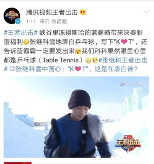 1月11日,腾讯视频王者出击通过微博发出张继科在雪地里深情写下“K❤ T”,并告诉摄影师一定要发出来的视频。