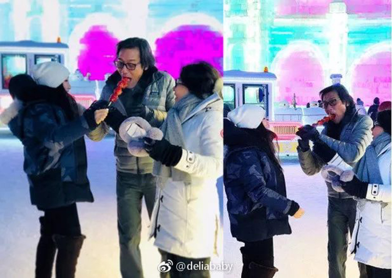 梁家辉一家在哈尔滨冰雪大世界吃糖葫芦
