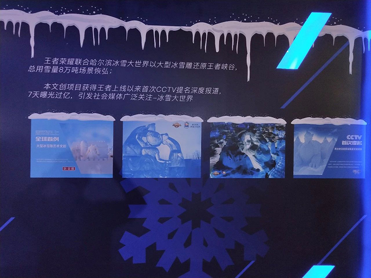 哈尔滨冰雪大世界 X 王者荣耀文创项目跨界创新合作得到社会广泛关注,省、市领导高度赞扬,获得王者荣耀上线以来首次CCTV提名深度报道,7天曝光过亿,引发社会媒体广泛关注。