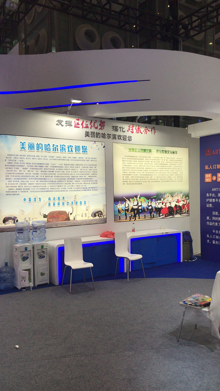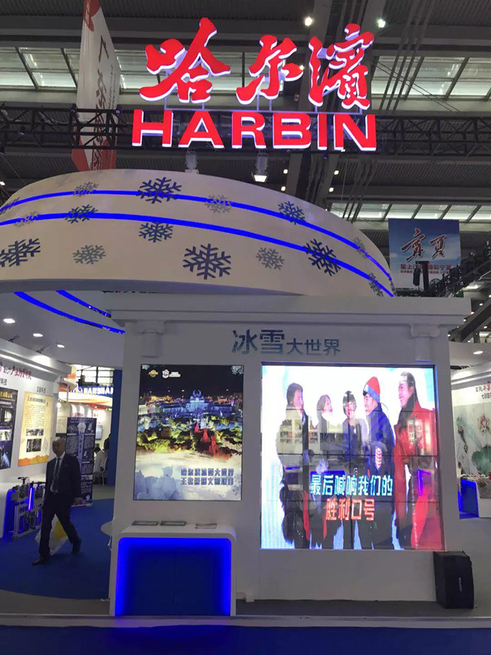 哈尔滨主展馆以蓝白两色为主色调,以雪花、音符、欧式建筑、琴键为主要设计元素,整个展馆清新淡雅。在举行了简短的开馆仪式后,省市领导来到哈尔滨冰雪大世界馆了解参展情况。