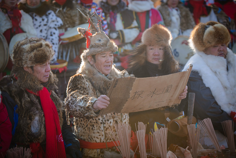 冰汉子们开始“滚冰”,“滚冰”即“滚病”,祈求去除百病。冰雪祭祀舞随之登场,舞者服装饰以兽骨、兽牙,所执抓鼓既是法器又是伴奏乐器。萨满舞祭祀天父地母和神江,为采冰祈福,祈祷家人平安、采冰顺利!
