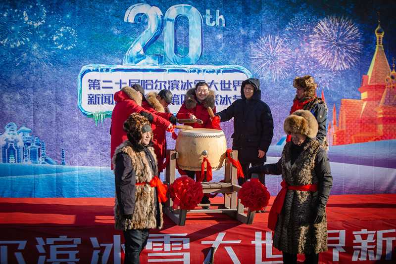 (哈尔滨市旅游发展委员会副主任于世泉、哈尔滨冰雪大世界股份有限公司总经理贾连琦、哈尔滨冰雪大世界股份有限公司副总经理罗昕、北大荒农垦集团总公司(农垦总局)党委委员、副总经理武安共同擂响采冰出征鼓)