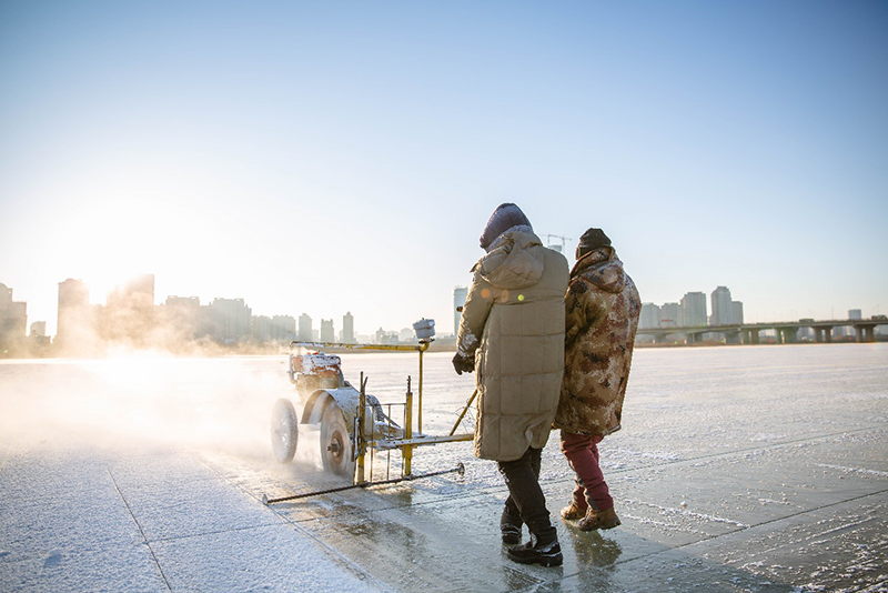 采冰技术人员首先用冰锯进行划线切割,然后按照标准尺寸用“冰镩子”开冰,最后将冰块缓缓拉出水面,按照固定规格切割装车。为保证园区冰景冰建完美体现,从采冰、运冰到施工各个环节都需严格把控。