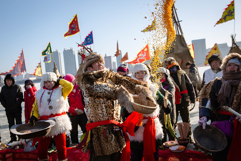 (冰汉子抛洒五谷祈福)