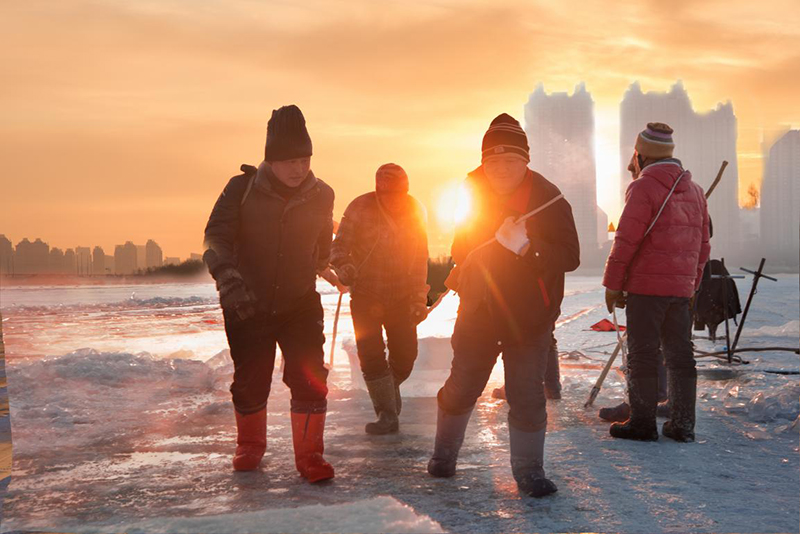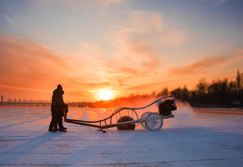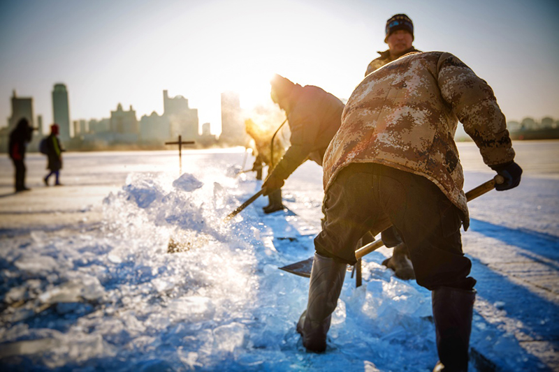 采冰工人们主要为来自周边县市的农民,今年采冰队的队员们,大多来自被称为“采冰之乡”的哈尔滨市松北区万宝镇,这个镇里,一个村就能组成好几个三十来人的采冰队。马文是今年采冰队伍中最年轻的汉子之一。“今年是第二年来了,赶上农闲,和村里的乡亲们一起搭伴来。”每年12月初,总有近千人如期而至,共赴冰雪之约,加入采冰队伍。“冬天在家闲着不如干点啥,采冰的话得每天凌晨三四点钟起来,一天干十几个小时,有时出了一身汗,把衣服都冻硬了。”“是挺辛苦的,但明年还要来,每天赚个大几百块钱,全下来快一万,能过个好年。”对大多数采冰人来说,采冰季给他们提供了赚取一笔不错收入的机会来贴补家用。