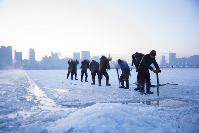 随后,断冰工们站在冰排上,使用近20斤重的专用工具“冰镩”凿击冰面。采冰队的王长元今年42岁,是个具有丰富经验的“老把式”了。大部分的冰块,两三下就被他从大冰排上断下,然后撬动冰块从冰排上分开。据他介绍,断冰是一个需要较高技巧的工作环节。“冰镩打太深了、打得靠边儿都很容易打碎冰块。冰块缺角了也不行,建设要用的冰块儿要求边角得完整。”