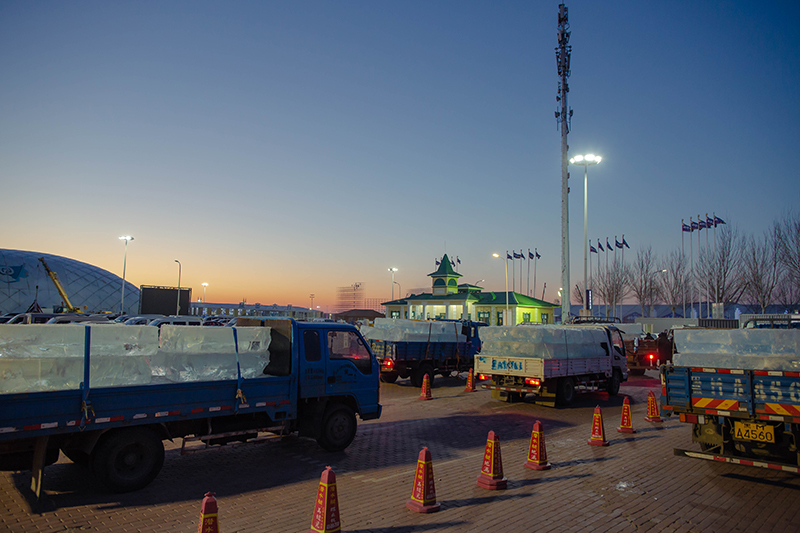 最后,采冰人采出的冰块被按照固定规格进行切割装车。为保证园区冰景冰建的完成效果,从采冰、运冰到施工各个环节,都需要严格把控。但即使格外小心翼翼,每个环节中,都会有一定概率的冰块断裂或缺角,产生不同程度的损耗。这也让最终冰景冰建的完美呈现显得呈现尤为来之不易。