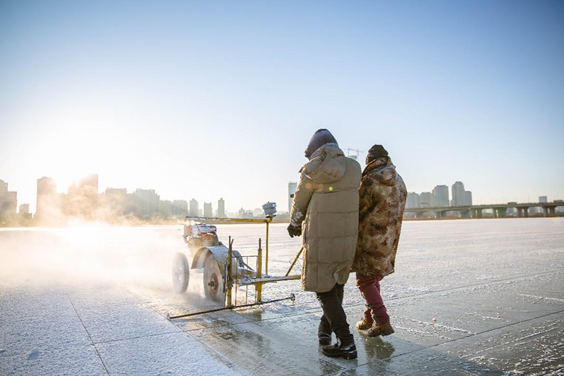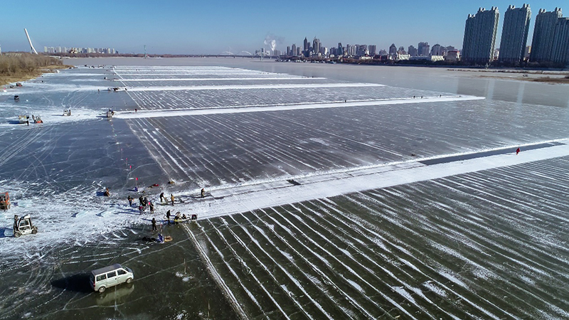 在确定采冰区域后,采冰技术人员首先需要在松江坚实的冰层上拉直线、量距离,用冰锯进行划线切割。