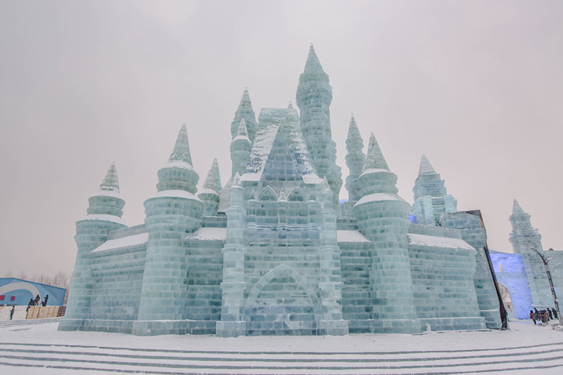 有飞檐精巧的中式亭台,也有满浸欧式风格的城堡楼阁,恢弘的园区将属于冰雪的艺术赋予每一座景观,向游客展示了独一无二的景致。