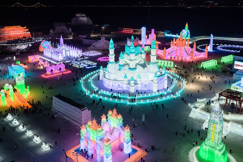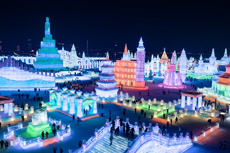 夜晚的冰雕在灯光下展示了巨大的魔力,如果你的恋人就在身边,可以和TA牵手来到耸立的冰雪婚礼圣殿下,在这个今年冬天最浪漫的爱情告白地两两相对,铭记此刻冰雪天地一双人的浪漫心绪。