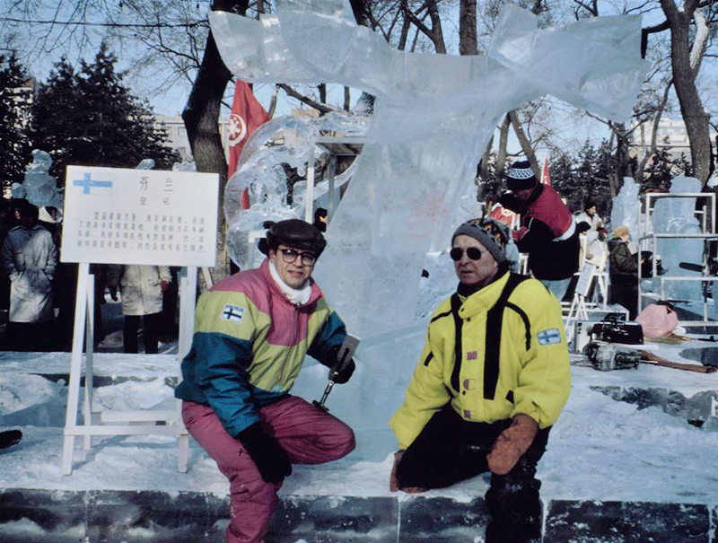 (1989年1月,芬兰冰雪雕艺术家尤哈尼•利尔伯格先生首次来哈参加第三届哈尔滨国际冰雕比赛)