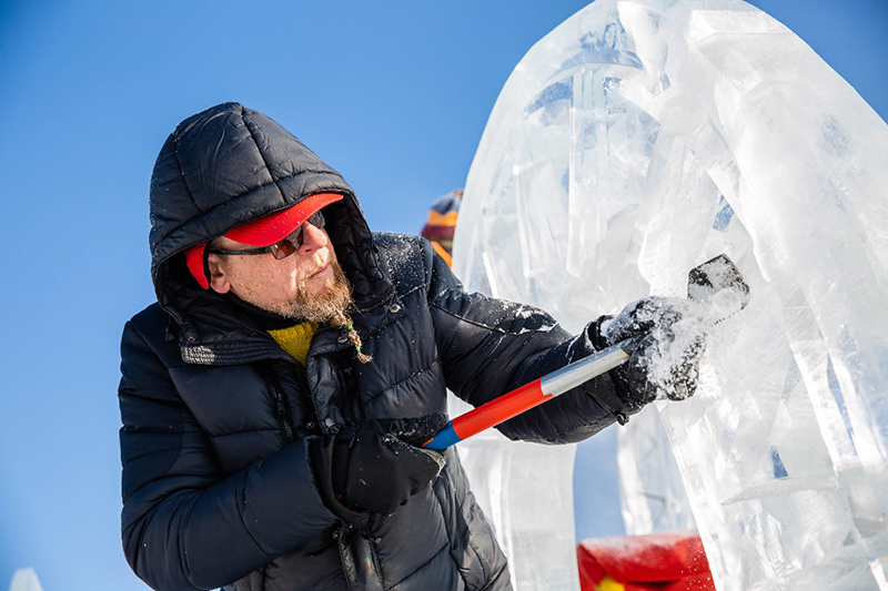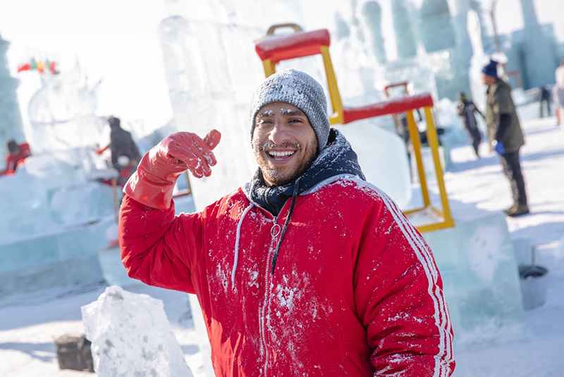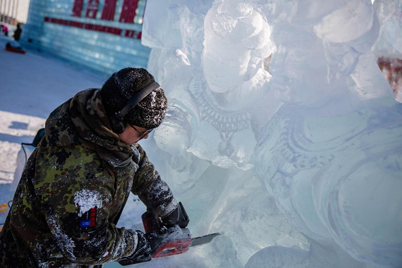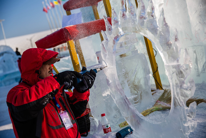 零下十几摄氏度的环境里,有一群来自世界各国的高手,连续数天在哈尔滨冰雪大世界园区内精心雕琢。冰雕刀清脆的挫冰声此起彼伏,油锯、直磨机不时发出嗡鸣,一组组冰块在冰雕艺术家的创作中,逐渐展露出精致华美的各色形态。