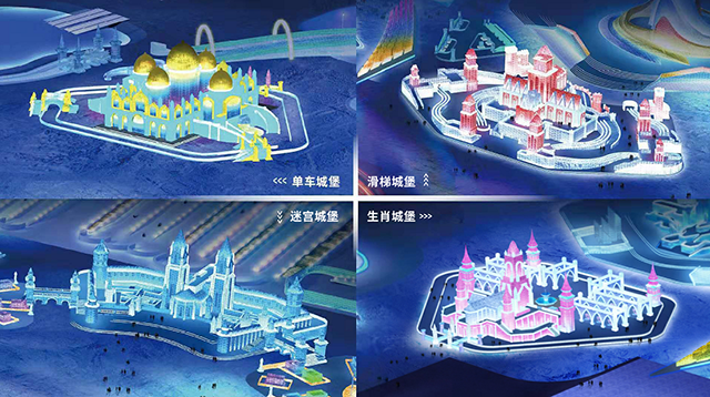 打造哈尔滨冰雪大世界四大娱乐城堡,结合声光电系统,让游客从单纯的欣赏冰景到走进冰建,实现人与冰建的互动、互通、互融、互景,人在景中游,景托人更秀。打造世界上最长的冰滑梯,让游客与滑梯、灯光联动,进一步提升娱乐性与趣味性。