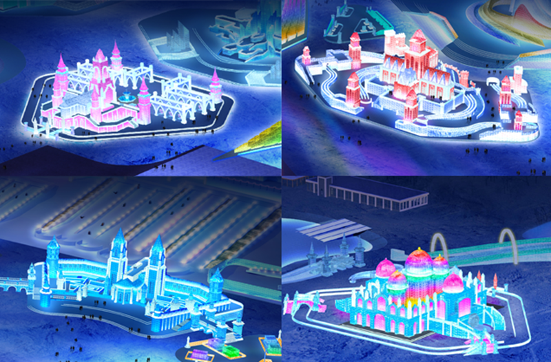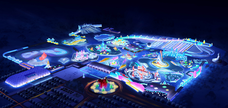 第二十一届哈尔滨冰雪大世界将冰建的观景功能与娱乐功能相结合,增强了人与景观的互动性。园区景观引入互动灯光控制技术,提高了动态灯光比例,实现人与景观的互动、景观光效与声效的互动、光效与游客运动的互动。设置四大主题城堡,结合声光电系统,让游客从单纯的欣赏冰景到走进冰建,实现人与冰建的互动、互通、互融、互景,人在景中游,景托人更秀。打造世界上最长的冰滑梯,让游客与滑梯、灯光联动,进一步提升娱乐性与趣味性。