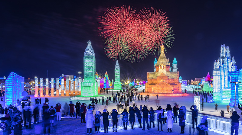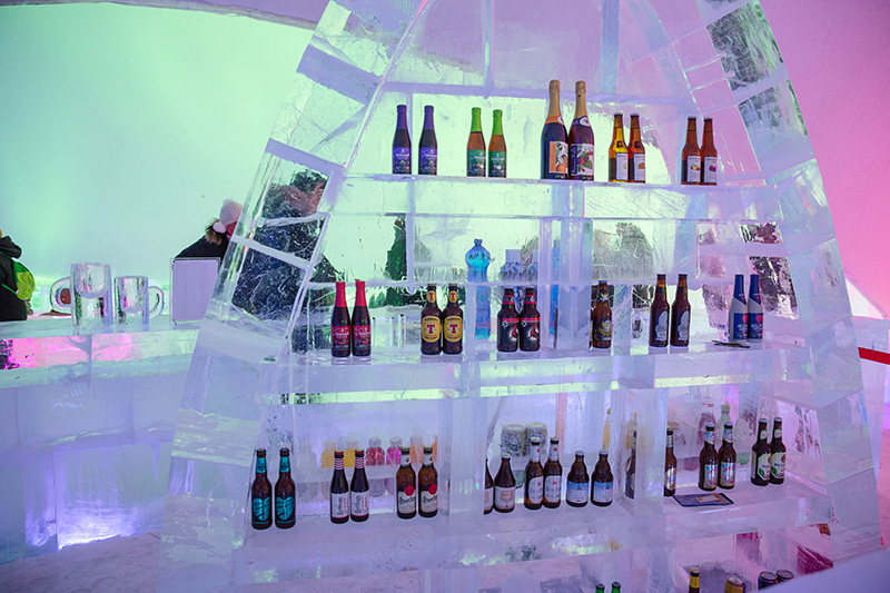 哈尔滨冰雪大世界利用“冰雪+科技”,采用充气膜+复合冰的方式建造冰雪餐厅,设置冰酒吧、冰火锅,让游客拥有别样的体验。