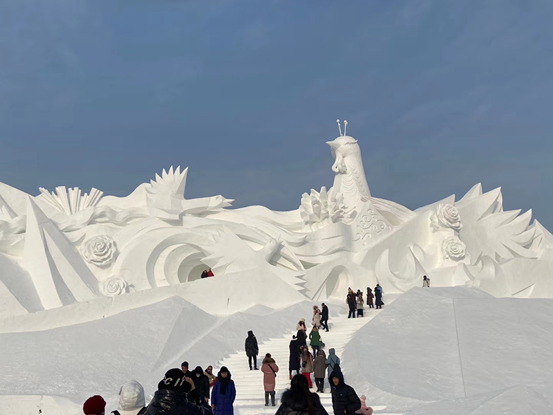 本届雪博会占地面积60万平方米,用雪量11万立方米,以中国传统造园中八景文化为基础,为游客打造印象深刻的雪雕艺术。