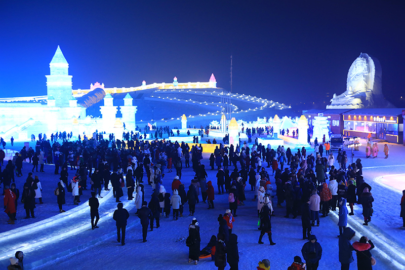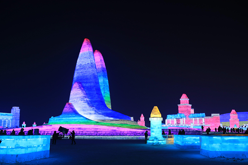 本届冰雪大世界占地面积60万平方米,用22万立方米的冰和雪,打造出21个冰雪景观群;用20余处互动娱乐项目,9项活动2项赛事,3400场免费演出,构成了一场顶级冰雪盛宴。