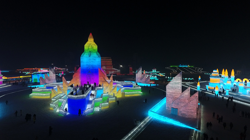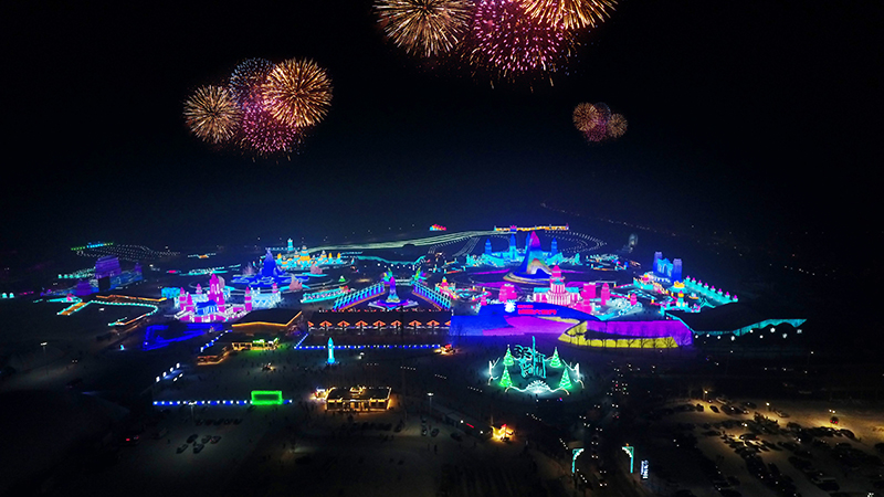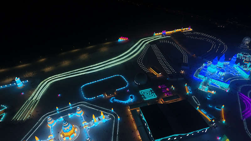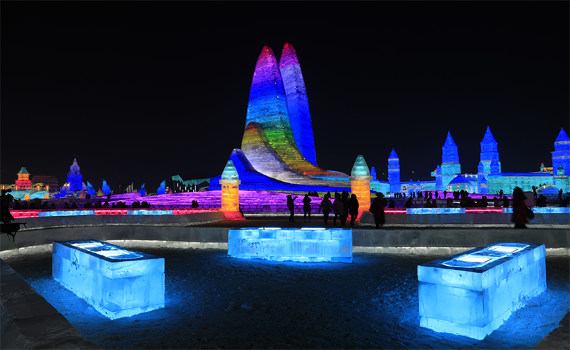 这座由冰雪筑就的庞大乐园,总占地面积60万平方米,用22万立方米的冰和雪,打造出世界最大的冰雪主题乐园。21个冰雪景观群,20余处互动娱乐项目,9项活动2项赛事,3400场免费演出,构成了一场冰雪盛宴。
