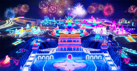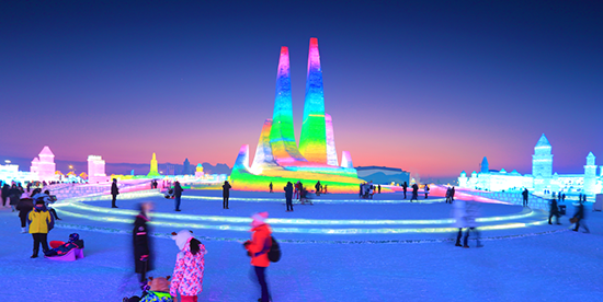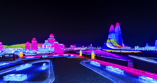 今年,哈尔滨冰雪大世界首次实现了园内主体景观的灯光联动,提高了动态灯光的比例。