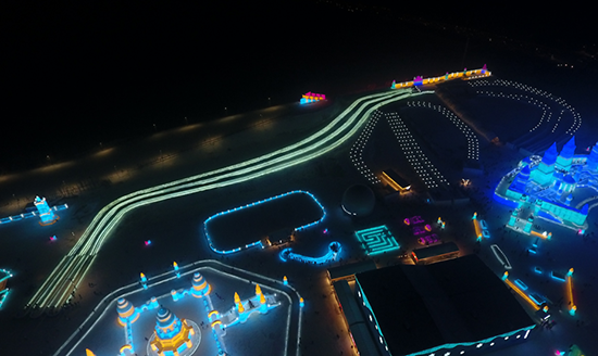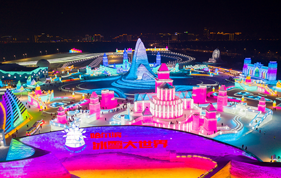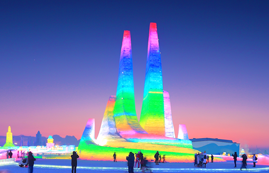 今年,哈尔滨冰雪大世界首次采用东西方向600米轴线的规划方式,设置双舞台结构。景区主塔首次采用“双子塔”设计,40米高,用冰量2万立方米,是景区内最大的单体建筑。通过“冰雪+建筑”,建成了体量最大的冰雪景观;通过“冰雪+灯效”,为游客奉献了美轮美奂的视觉盛宴;通过“冰雪+演艺”,打造了国内独一无二的“哈冰秀”;通过“冰雪+娱乐”,万人迪士高和跨年夜冰雪摇滚节,打造景区内最火爆的场景;通过“冰雪+赛事”,每年举办两个国际级的冰雕比赛;通过“冰雪+互动”,世界最长的冰滑梯让游客感受到速度与激情;通过“冰雪+科技”,采用充气膜+复合冰的冰建新技术建造冰雪餐厅,开发小火锅,让游客体验冰火两重天。
