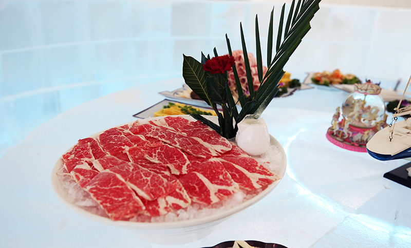 新鲜牛肉卷、羊肉卷、冻豆腐……涮冰火锅的菜品非常丰富,还有酸菜、冻柿子等东北特色菜品,欣赏完如似梦幻的冰雕后,走进这个宽敞的冰屋子,坐在冰桌子、冰椅子上吃着热气腾腾的火锅,那就一个“爽”。但在冰屋里吃火锅有一个秘诀就是一定要快点吃,不然菜品就被冻上了,最好是吃完一道菜,再点下一道菜。