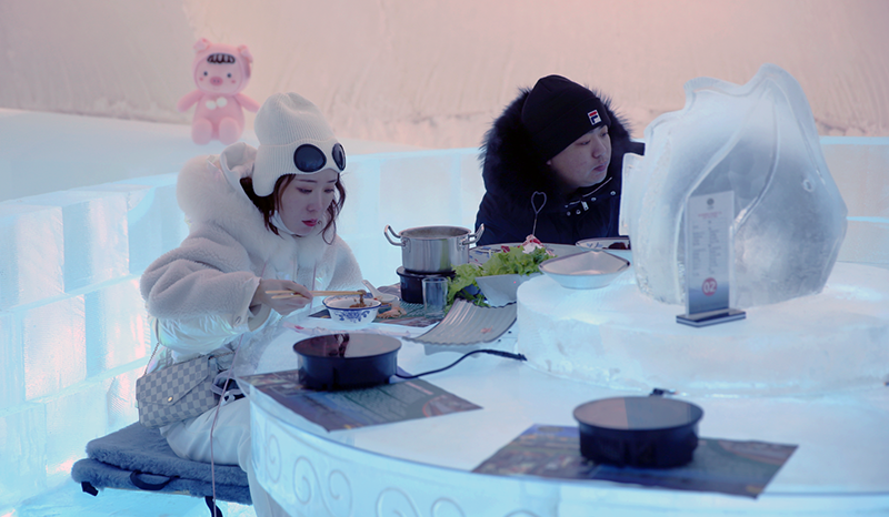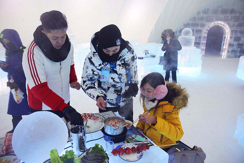 游客正在冰屋里面吃冰火锅。