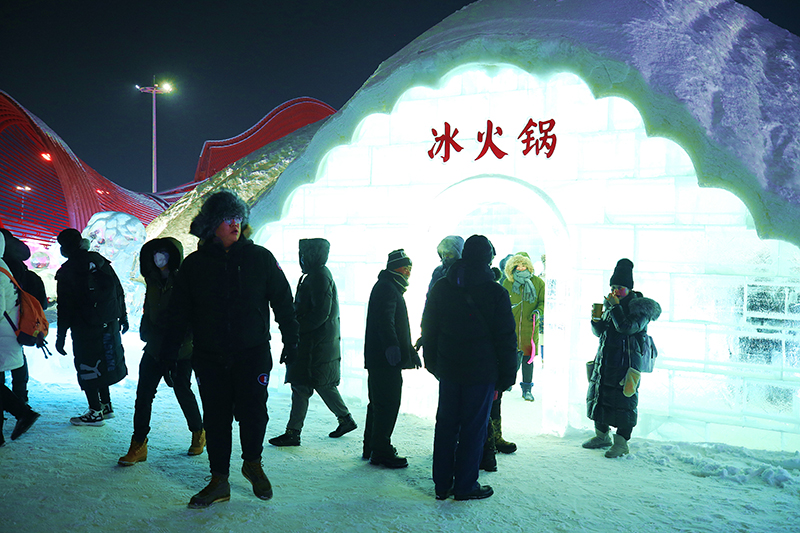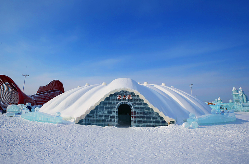 游览在哈尔滨冰雪大世界园区内,许多游客被园区里一座形似大贝壳的冰雪建筑所吸引,构造精巧的几座冰建筑就是冰火锅和冰酒吧。